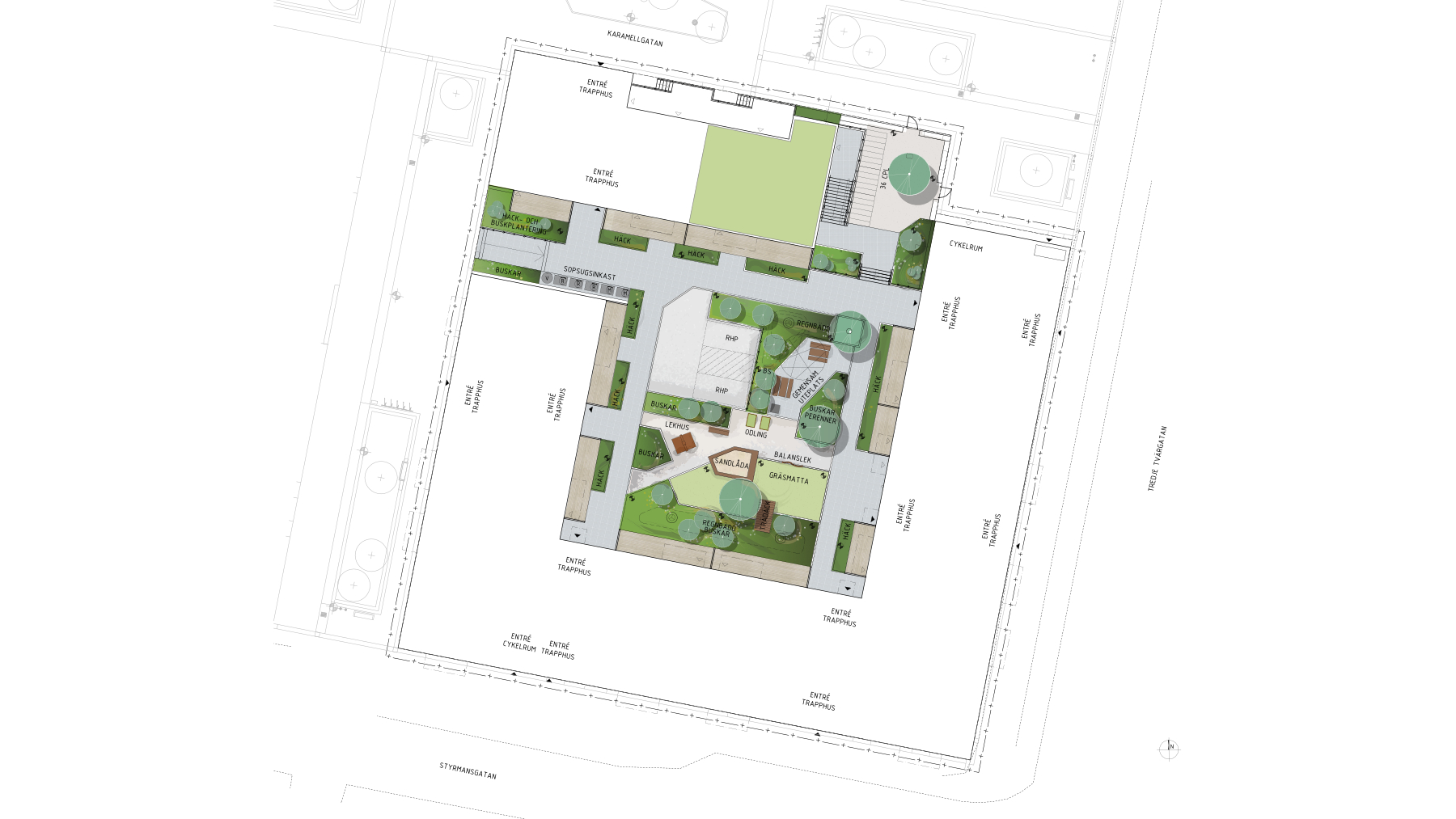I norra Brynäs i Gävle har produktionen av 91 nya hyreslägenheter påbörjats. Vi har ansvarat för utformningen av bostadsgården som är utformad för att rymma platser för social samvaro, lek, dagvattenhantering, parkering, privata uteplatser, uppställningsplatser för brandförsvarets stegar, cykelparkering och sophantering. Gårdens grönska är en central byggsten, där andelen grönyta är anpassad efter detaljplanens krav. Tillgänglighet och framkomlighet har noggrant utretts för att säkerställa rätt lutningar och mått, vilket skapar en inkluderande och fungerande utemiljö för alla. Gårdens utformning är också en viktig del av planförslagets dagvattenstrategi, där dagvatten ses som en värdefull resurs – både estetiskt, biologiskt och hydrologiskt. Den lokala hanteringen av dagvatten på plats bidrar till att mildra effekterna av kraftiga regn, samtidigt som det bidrar till en levande och grön miljö.